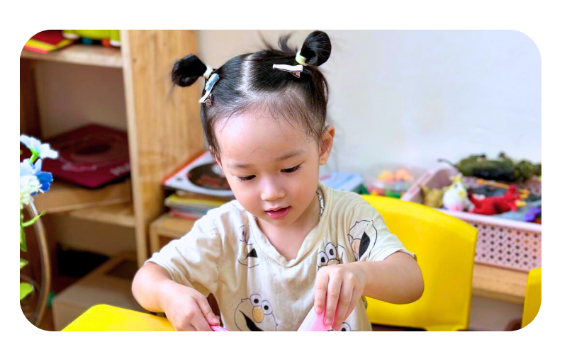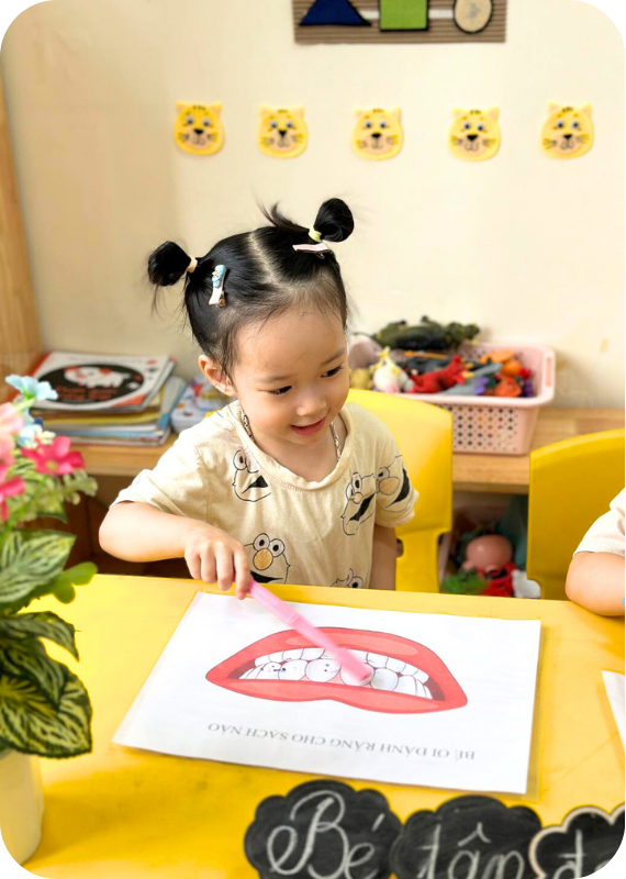 Chúng tôi có các phương pháp dạy chữ , tô vẽ, ghép hình, ngoại ngữ giúp trẻ học một cách tự nhiên thông qua trò chơi và giao tiếp hằng ngày. Trẻ phát triển khả năng sáng tạo qua khả năng vẽ, phát triển khả năng nghe, nói, nhận dạng chữ chữ và hình nền tảng ngôn ngữ ngôn ngữ sớm.